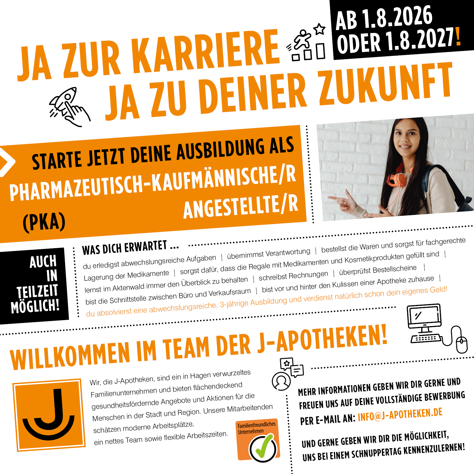 Wir, die J-Apotheken, sind ein in Hagen verwurzeltes Familienunternehmen und bieten flächendeckend gesundheitsfördernde Angebote und Aktionen für die Menschen in der Stadt und Region. Unsere Mitarbeitenden schätzen moderne Arbeitsplätze, ein nettes Team sowie flexible Arbeitszeiten.